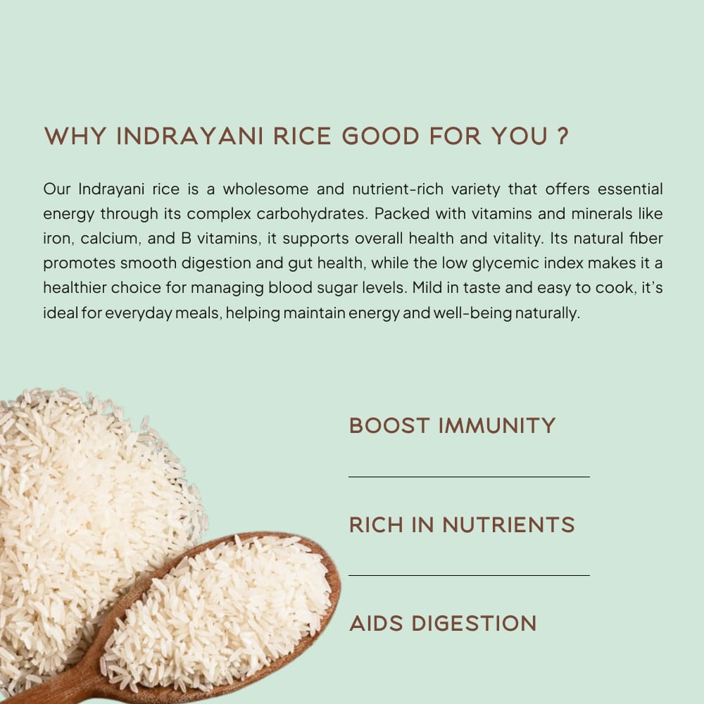 Indrayani rice offers benefits like being rich in fiber, vitamins (B1), and minerals, aiding digestion, promoting satiety for weight management, and having a low glycemic index (good for diabetics) due to its nutrient-dense, often unpolished nature, providing energy, supporting heart health, and offering a unique aroma and soft texture. It’s a versatile, gluten-free grain that helps maintain gut health, lowers cholesterol, and supports a balanced diet, especially when consumed unpolished